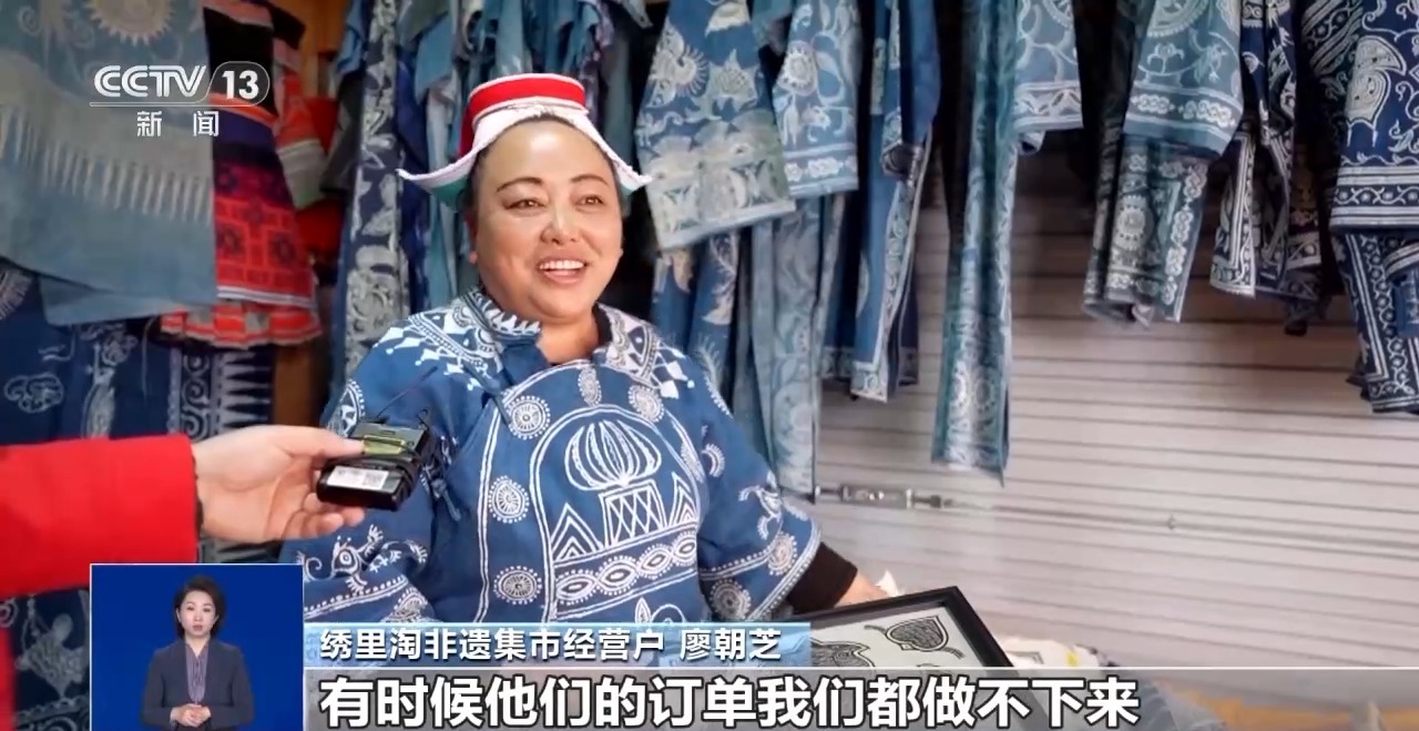 绣里淘非遗集市经营户 廖朝芝:我们家主要是卖蜡染。顾客很喜欢,有时候给我们介绍订单,有时候他们的订单我们都做不下来。