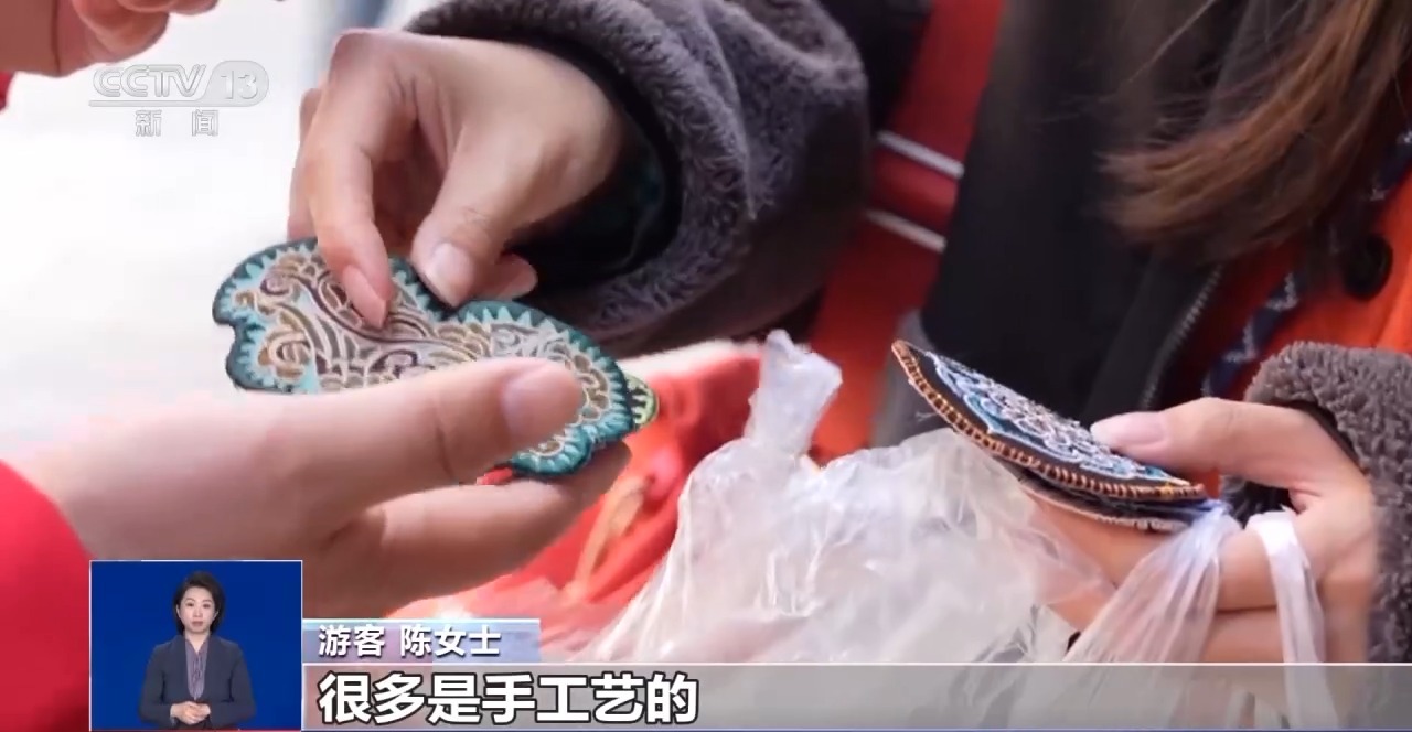 游客 陈女士:就买了一个包、一幅画,然后还有两个贴片。很多是手工艺的。