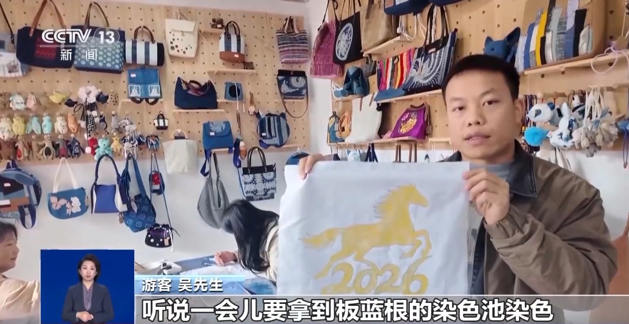 游客 吴先生:我画的是一幅奔马,听说一会儿要拿到板蓝根的染色池染色,脱蜡以后做成方巾。明年是2026年,祝大家马到成功。